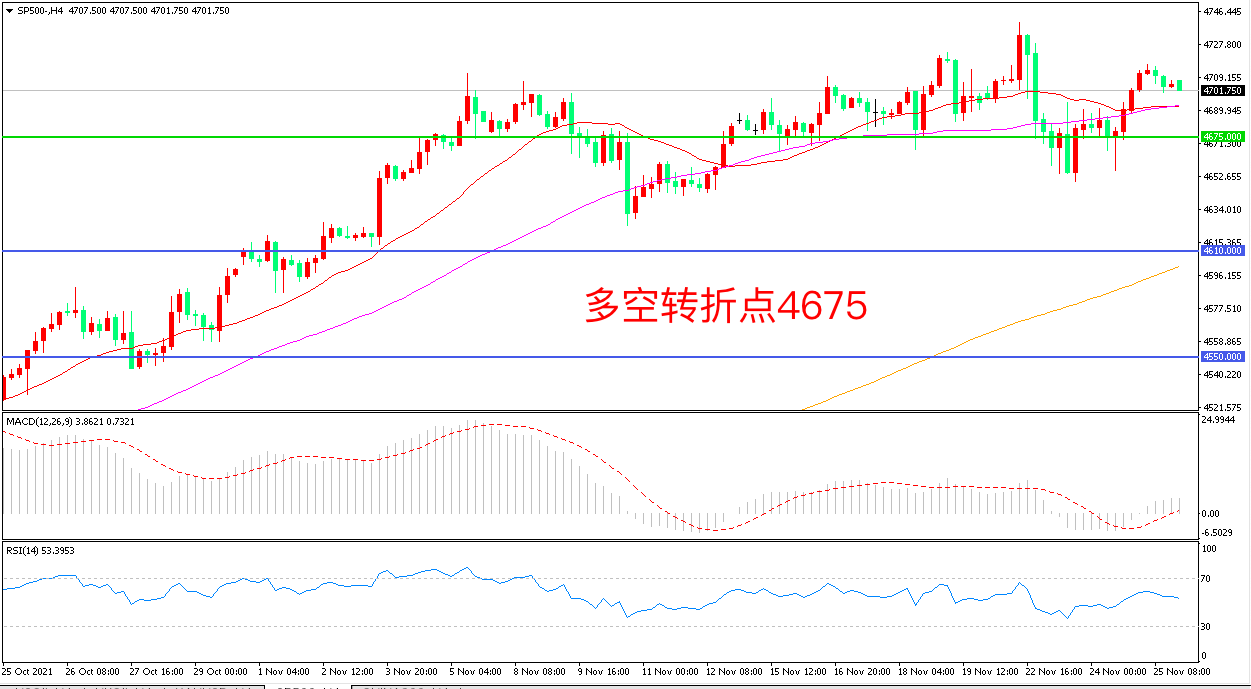 4小时图看,标普500以4675为依托小幅反弹,短期走势回暖,均线系统形成下方支撑,MACD绿柱缩短,RSI指标走平,日内震荡上行概率较大。