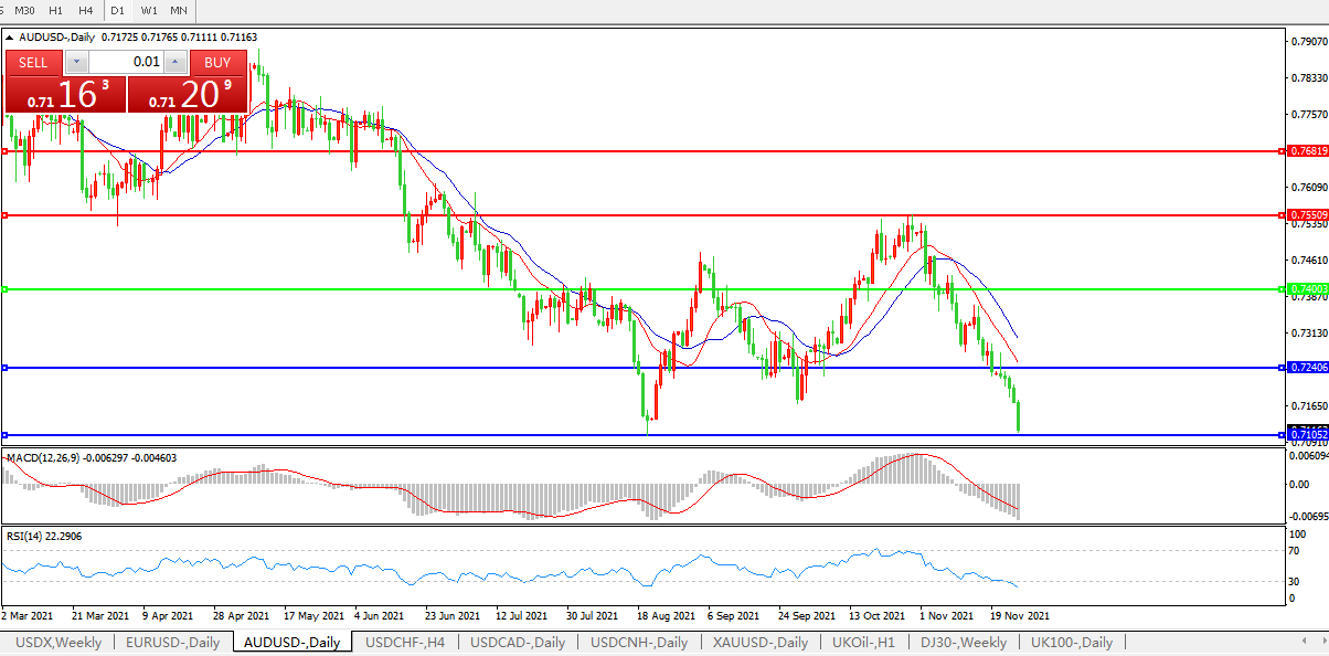 澳元兑美元跌0.93%至0.7123,盘中触及0.7113,为8月20日以来最低。纽元兑美元跌0.54%至0.6823。
