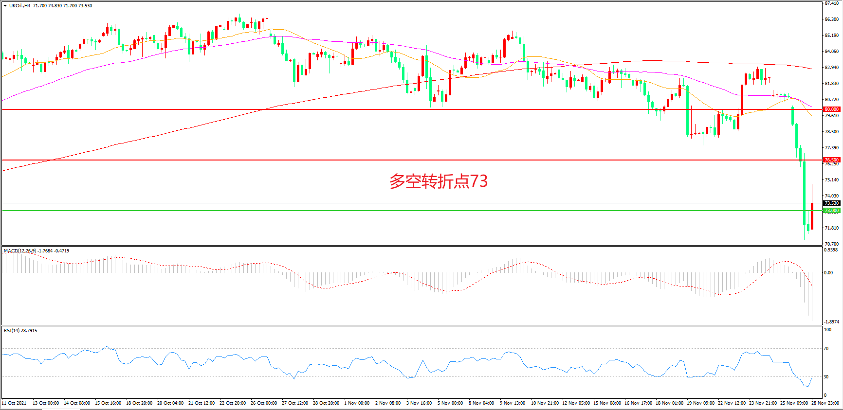 4小时图看,油价触碰76美元后冲高回落,短期走势陷入震荡,均线系统呈空头排列,MACD绿柱增加,RSI指标走平,日内震荡下行概率较大。