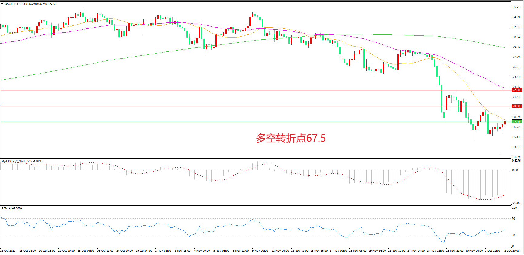 4小时图看,油价探底回升,短期走势有所回暖,但均线系统呈空头排列,67.5美元成为多空分水岭,MACD绿柱缩短,RSI指标走平,日内延续震荡概率较大。