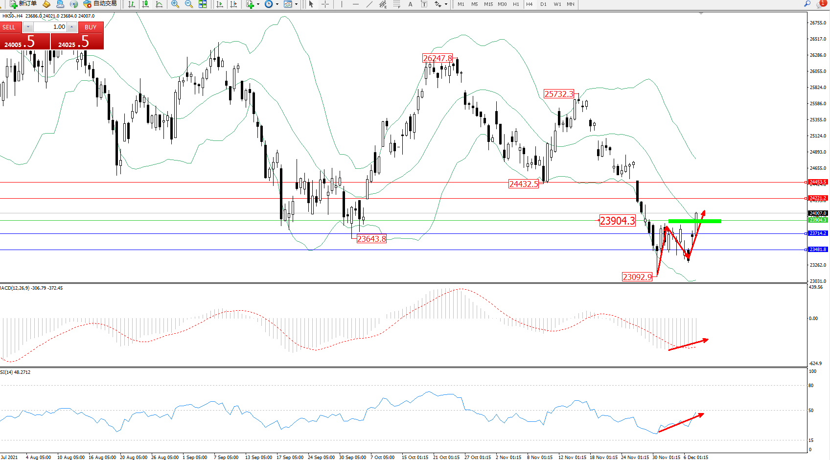 香港恒生指数12月7日(周二)收盘上涨634.28点,涨幅2.72%,报23983.66点;港股今日大反弹,此前连续下跌的科技股领衔上涨,致恒生科技指数大幅收涨4.21%,大型互联网科技股阿里巴巴大涨超12%昨日盘中创历史新低,百度大涨近10%,快手、网易、美团皆涨超5%,腾讯涨3.57%;今日大市成交额为1534亿港元,南下资金净流入41.11亿港元。部分香港本地股走强,九龙仓置业涨近4%,华人置业和堡狮龙涨约2%。香港特区行政长官林郑月娥出席行政会议前表示,香港与内地免隔离检疫通关协商取阶段成果,虽然目前无中港通关时间表,但林郑月娥预告中港通关初期会设配额制,优先考虑逼切需要进入内地人士如商务、公务需要,未特别提及探亲需要。