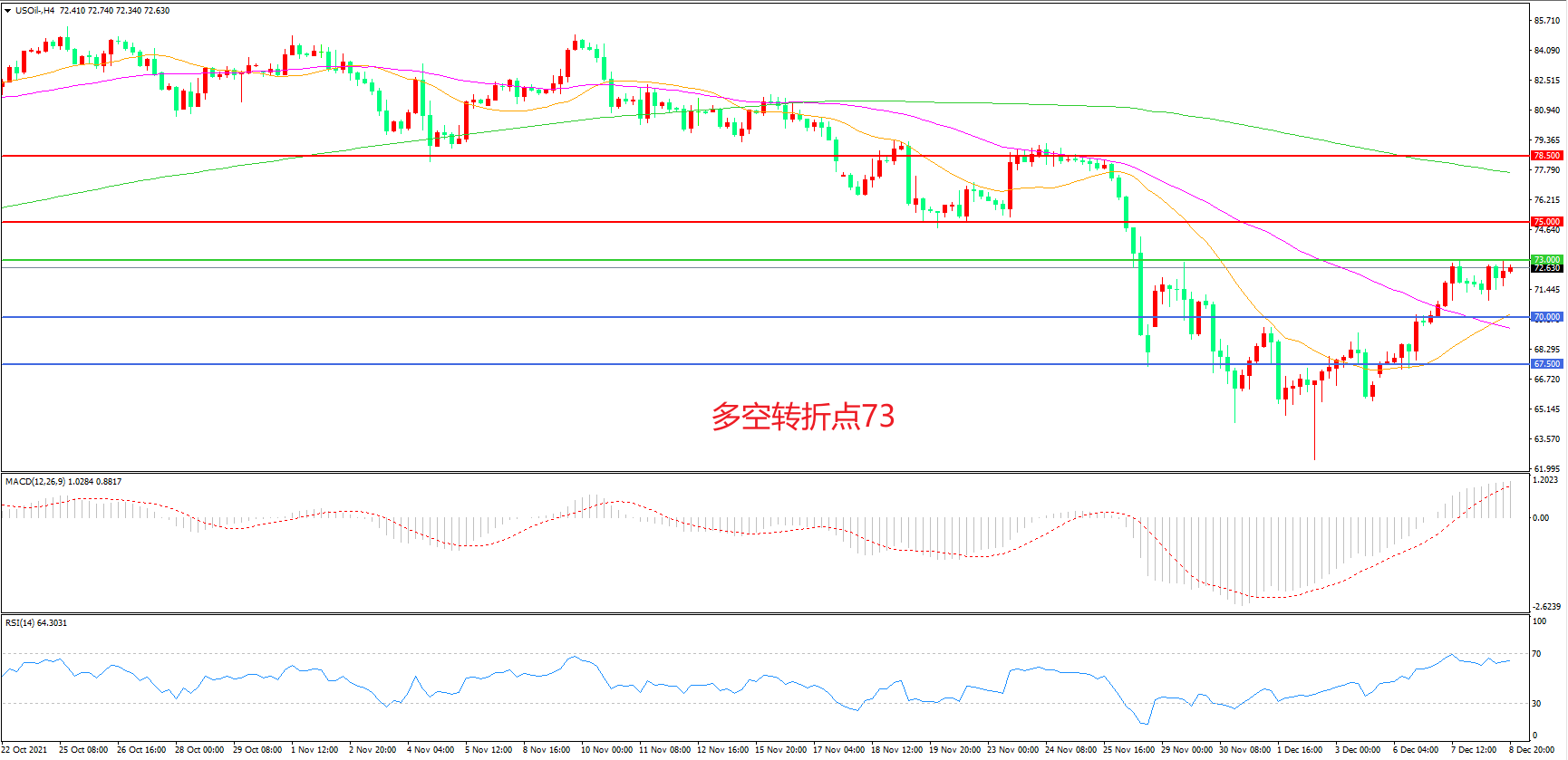 周三(12月8日),根据美国能源信息署公布的数据显示,当周EIA原油库存降幅不及预期,精炼油库存和汽油库存大增,但随着奥密克戎新变种的担忧缓解,市场情绪依然相对乐观, 美国WTI原油震荡反弹,收报72.54美元/桶。油价的剧烈波动显示目前市场进入到短线相持阶段,这种状态需要新的变量出现来改变,市场可能会将焦点转移到伊核协议的谈判上。
