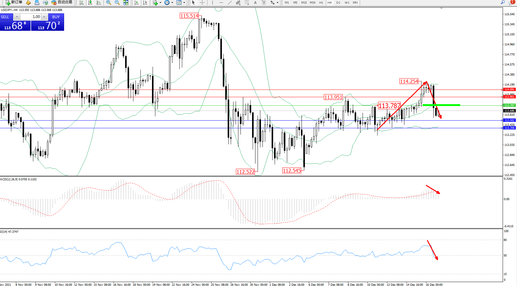 交易策略:113.787下方看跌,目标113.502、113.356