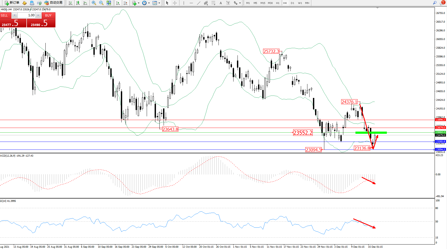 技术点评:高位空头动力急速下挫,跌破布林带指标下轨至23136位置得到支撑快速拉升,多头动力开始短期伺机入场,但高位空头动力强劲,短期仍有维持整理走势迹象,布林带指标呈缓慢张口走势中,MACD指标处于空头区域维持整理缓慢下移,RSI指标处于50均衡线下方空头区域维持整理中;