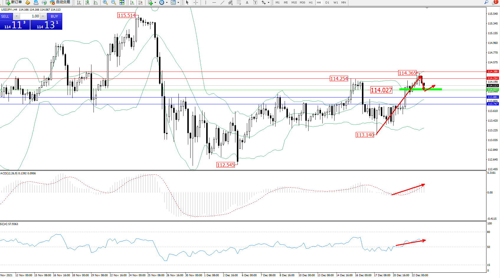 技术点评:低位多头动力维持震荡上扬,短期突破前期高位至114.365位置附近短期遇阻回撤,布林带指标呈缓慢张口走势中,MACD指标处于0轴线上方维持整理上移,RSI指标处于50均衡线上方维持震荡;