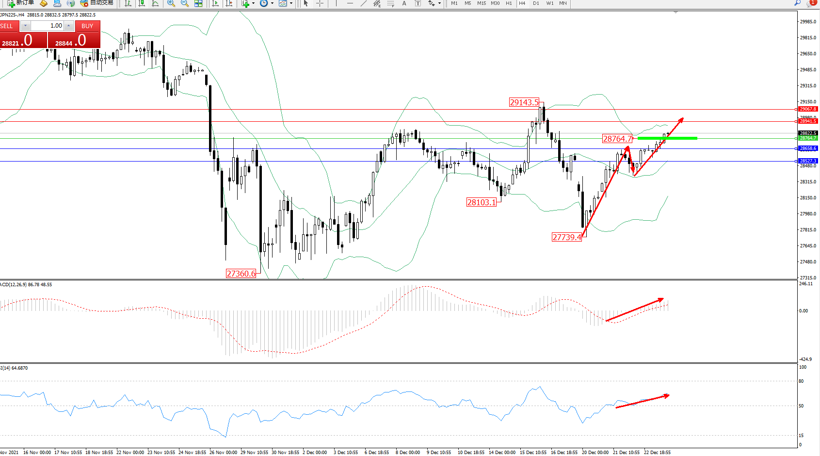 日经225指数12月23日(周四)收盘上涨214.79点,涨幅0.75%,报28777.00点。日本将2022财年实际GDP增速预期从2.2%上调至3.2%,如果增速预期得以实现,将创下2010财年以来最快的经济增速。其中,刺激性支出预计将推动财年GDP增长1.5%,推动下财年GDP增长3.6%。本次修正后的预期将为周五编制的2022财年预算提供依据。