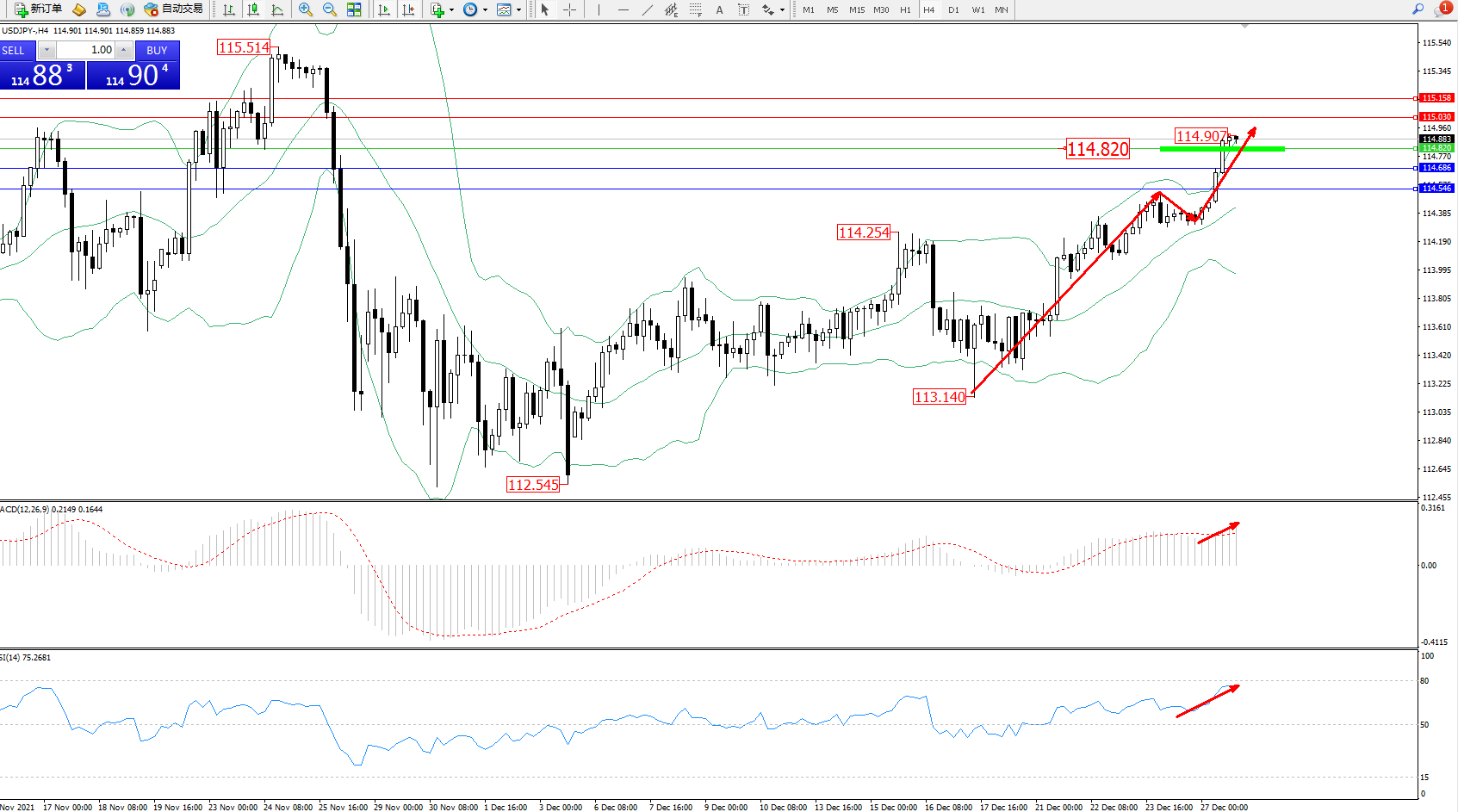 技术点评:多头动力延续布林带指标通道中上轨区间持续震荡上扬,高位抵达114.907位置后短期遇阻,多头动力有继续攀升迹象,布林带指标呈上行趋势走势良好,高位开始有张口走势,且有继续攀升态势,MACD指标处于多头区域维持整理平移后开始上扬,RSI指标处于多头区域维持震荡上移后处于高位整理;