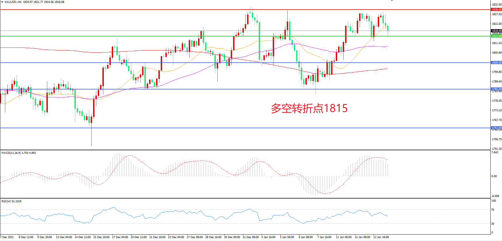4小时图看,金价突破1815后陷入震荡,1830成为短期阻力,均线系统走平, MACD红柱缩短,RSI指标走平,日内延续震荡概率较大。