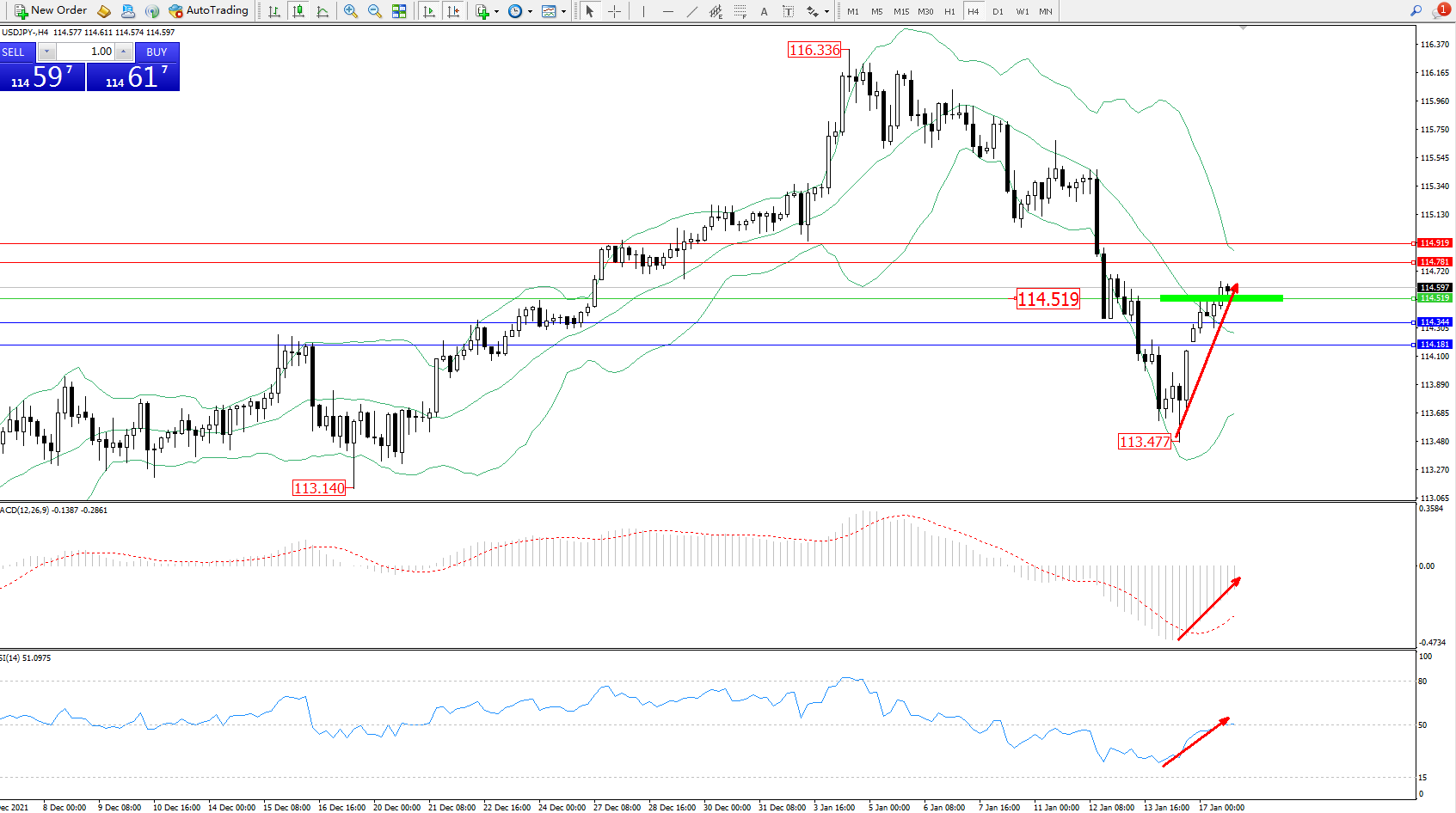 美元兑日圆维持114.597附近震荡,日本政府在内阁会议上敲定了2022年度经济预期。预计剔除物价变化因素的实际国内生产总值(GDP)增长率为3.2%,名义GDP为3.6%。GDP实际总额估计达556.8万亿日元(约合人民币31万亿元),若能实现将创历史新高。得益于2021年11月制定的经济对策等,2022年一季度(1至3月)有望恢复至疫情前(2019年四季度)水平。另一方面则指出,也有必要注意疫情再次蔓延的影响及原材料价格变动等下行风险。