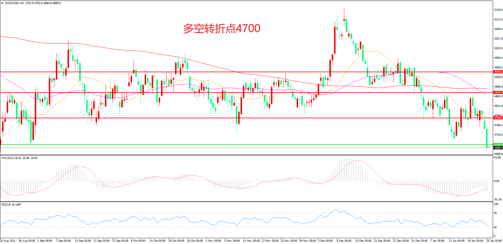 4小时图看,沪深300长阴下破,短期走势偏空,4790成为上方阻力,4700成为多空分水岭, MACD绿柱增加,RSI指标走平,日内震荡下行概率较大。