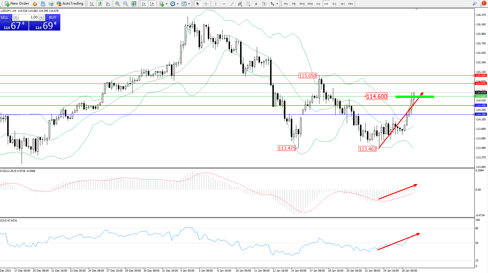技术点评:低位多头动力延续布林带指标上轨附近节点持续震荡拉升上扬中,短期多头动力未见有止步迹象,布林带指标呈张口走势持续,前期高位115.050位置近在咫尺,破位在即,MACD指标低位多头动力维持震荡上移至0轴线附近节点徘徊,RSI指标处于50均衡线上方不断拉升中;