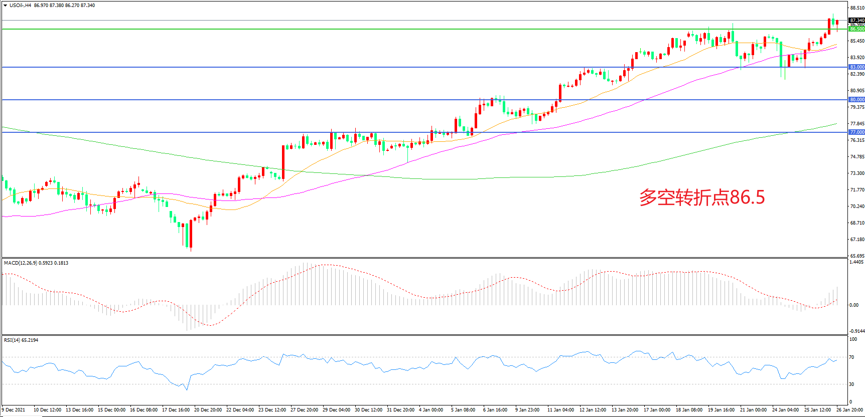 4小时图看,油价回踩86.5美元一线后再度上行,短期走势回暖,均线系统成为下方支撑,MACD红柱增加,RSI指标走平,日内震荡上行概率较大。