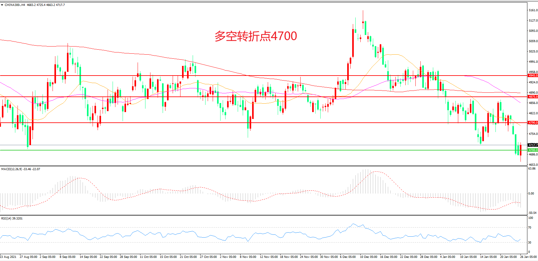 4小时图看,沪深300连续下破后反弹,短期走势有所回暖,但均线系统依然呈空头排列, 4700成为多空分水岭, MACD绿柱增加,RSI指标走平,日内延续震荡概率较大。