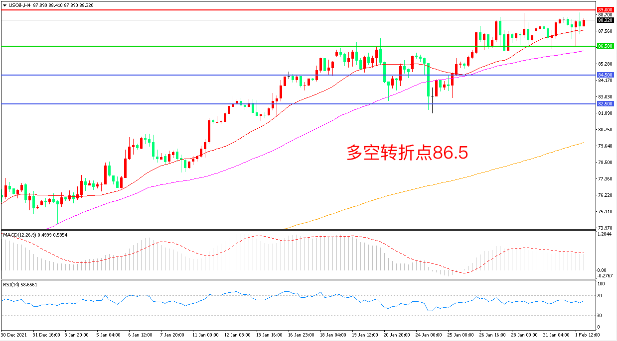 4小时图看,油价延续高位调整走势,区间震荡继续明显,均线系统成为下方支撑,89美元成为上方阻力,MACD红柱增加,RSI指标走平,日内震荡上行概率较大。