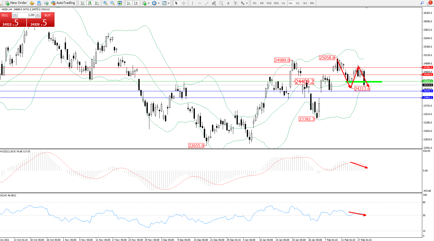 香港恒生指数2月18日(周五)收盘下跌465.06点,跌幅1.88%,报24327.71点;港股主要指数尾盘快速下跌,恒生科技指数更是大跌3.22%。今日南下资金净流出12.26亿港元,大市成交额为1262亿港元。发改委引导外卖平台下调服务费标准,权重科技股美团跳水暴跌近15%,腾讯、京东、阿里巴巴、小米纷纷跟跌,为拖累市场下跌的主因;据香港经济日报,香港今日确诊3629例新冠病例,并录约7600宗初确,而首批内地专家组、以及两辆移动核酸检测车昨午抵港作考察。香港特首表示,若检测能力提升,全港性的全民检测是考虑方案。至于会否禁足及封城,林郑指会尽量考虑一直以来的做法。她指出,今日的确诊个案是3000多例,但相信是尚未见顶,在中央支持下已制造方案全民强制检测,起码要两至三个月才控制到疫情。
