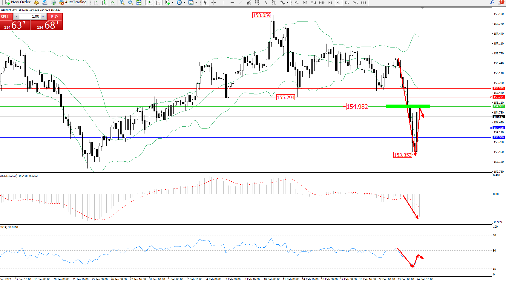 交易策略:154.982下方看跌,目标154.258、153.936