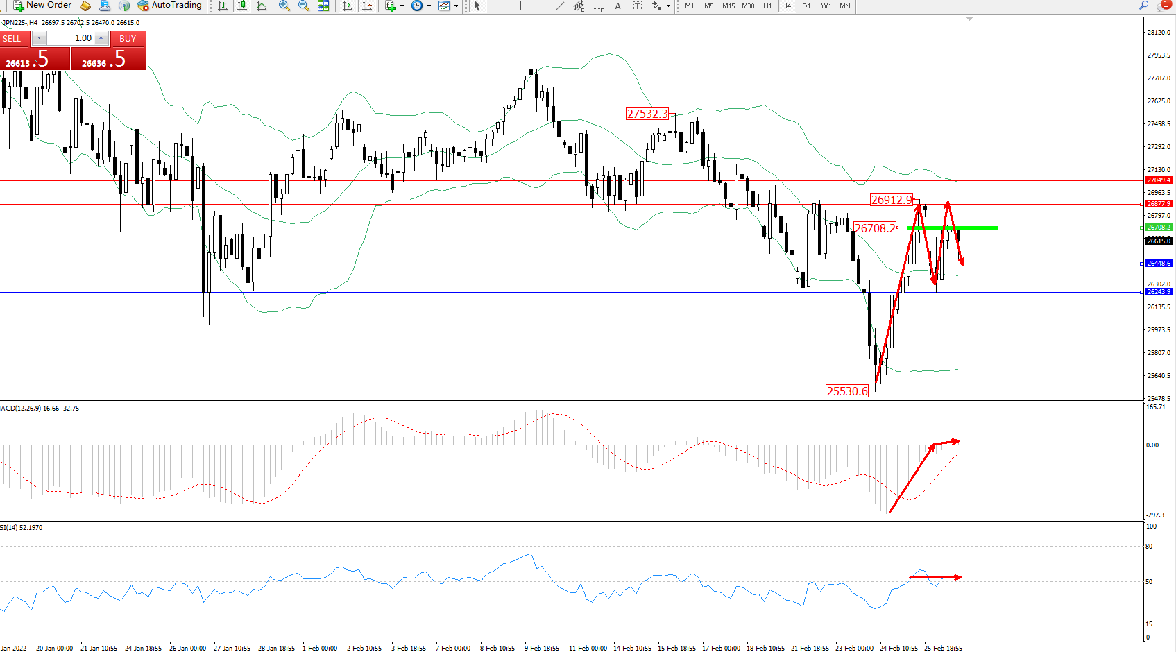技术点评:低位多头动力强势震荡拉升上扬,高位抵达26912位置节点后开始宽幅震荡,短期纠结于布林带指标通道中上轨区间整理,布林带指标呈收口走势持续平移中,MACD指标低位多头动力维持震荡上移至0轴线附近徘徊,RSI指标处于50均衡线附近弱势整理中;