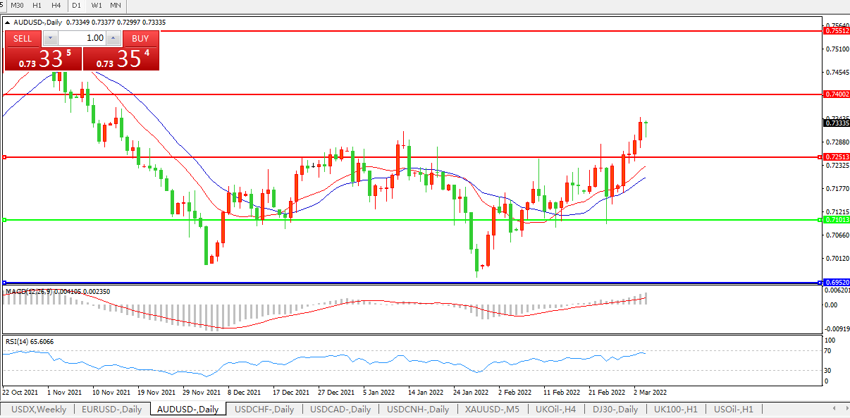 技术面简析:日图均线呈多头排列,汇价整体维持攻势,MACD运行于0轴上且量能小幅放量,RSI小幅上攻,预计汇价大概率将进一步上行。