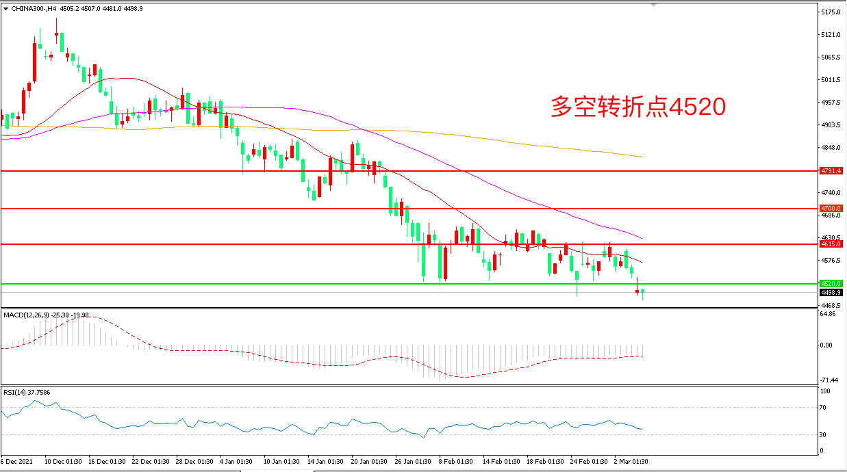 4小时图看,沪深300 低开低走,跌破前期整理区间,短期走势较弱,4520成为多空分水岭, MACD绿柱增加,RSI指标走平,日内震荡下行概率较大。