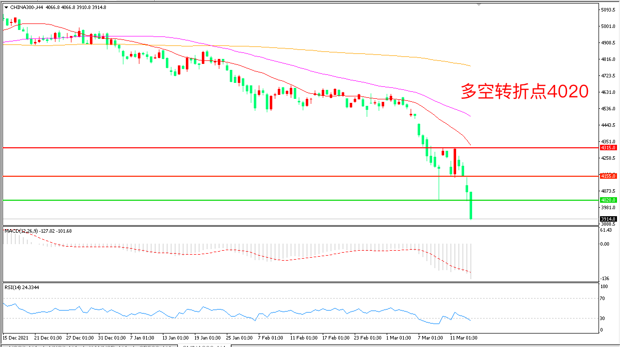 4小时图看,沪深300 长阴连续下破,短线走势低迷,均线系统呈空头排列, MACD绿柱增加,RSI指标走平,日内震荡下行概率较大。