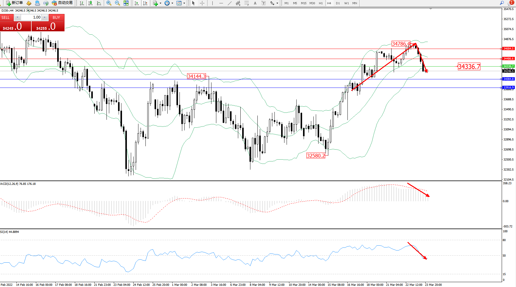 道琼斯指数3月23日(周三)收盘下跌449.69点,跌幅1.29%,报34357.77点; 美股收盘,道指高位震荡收跌,美联储主席鲍威尔周一表示,在未来几个月,如果有必要,美联储做好了以超过25个基点幅度加息的准备。美联储在5月和6月会议上都会将基准利率提高50个基点。根据纽约联储银行的数据,对隔夜逆回购协议的需求在周三跃升至1.8万亿美元,创下历史第二高水平。面对利率快速上升的前景,投资者尽可能缩短所持资产的到期期限,以便未来几个月利率上升速度比预期更快时可以更灵活地配置现金,这种心态推升了投资者对隔夜逆回购协议的参与热情。
