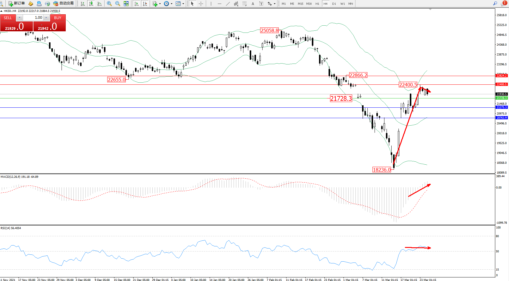 技术点评:低位多头动力强势震荡上扬,触及布林带指标上轨22400附近节点后开始整理,短期多头上行后遇阻,布林带指标呈缓慢张口走势持续中,MACD指标处于0轴线上方维持震荡上扬,RSI指标处于50均衡线上側维持整理平移中;