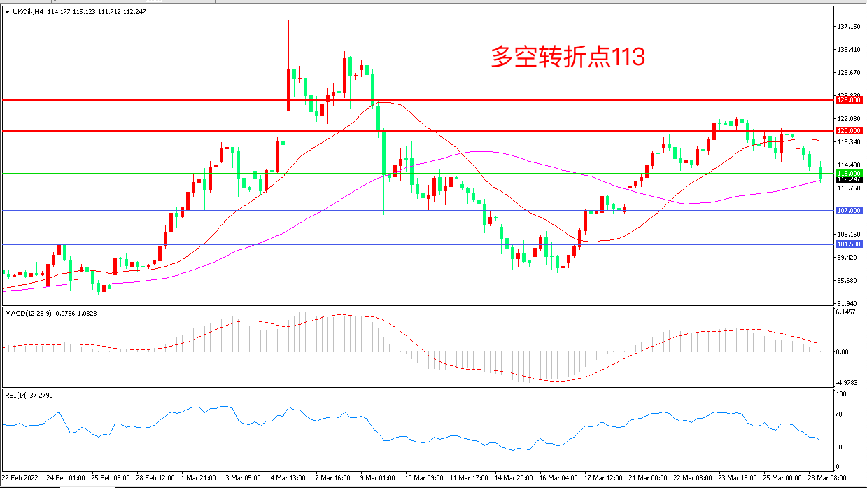 4小时图看,油价破位下行,暂时企稳于200周期均线,113成为多空分水岭,MACD绿柱增加,RSI指标走平,日内延续震荡概率较大。