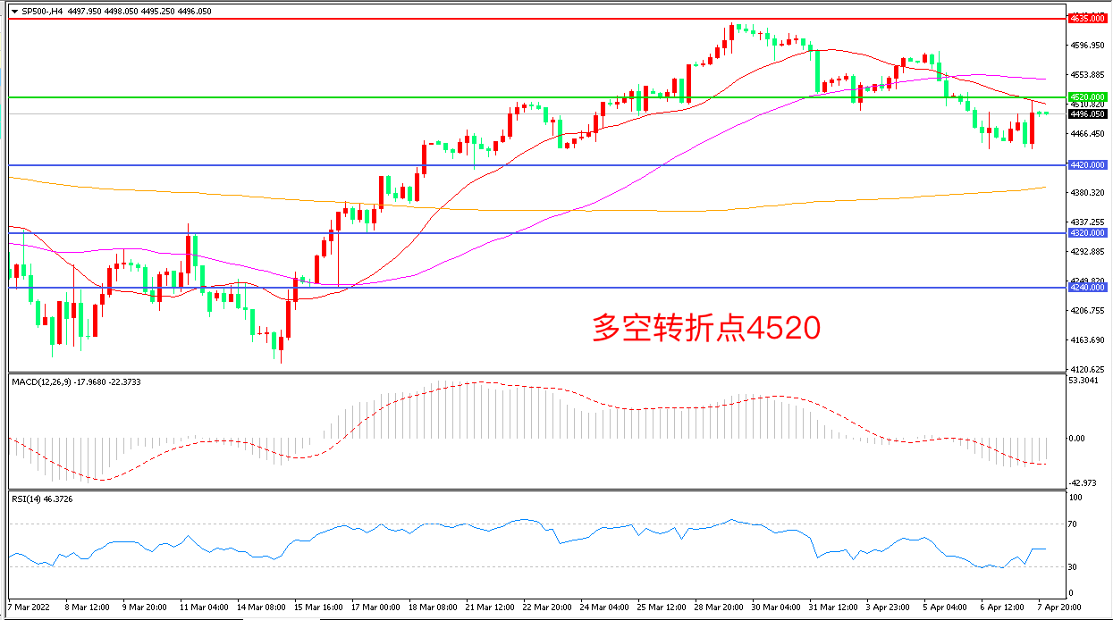 4小时图看,标普500触底反弹,但整体仍受制于21周期均线,MACD绿柱缩短,RSI指标走平,日内震荡回落概率较大。