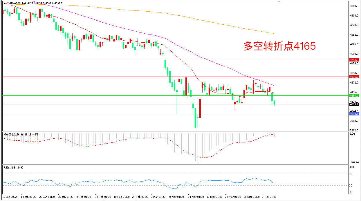 4小时图看,沪深300低开低走,整体表现低迷,均线系统成为上方阻力, MACD绿柱增加,RSI指标走平,日内震荡下行概率较大。
