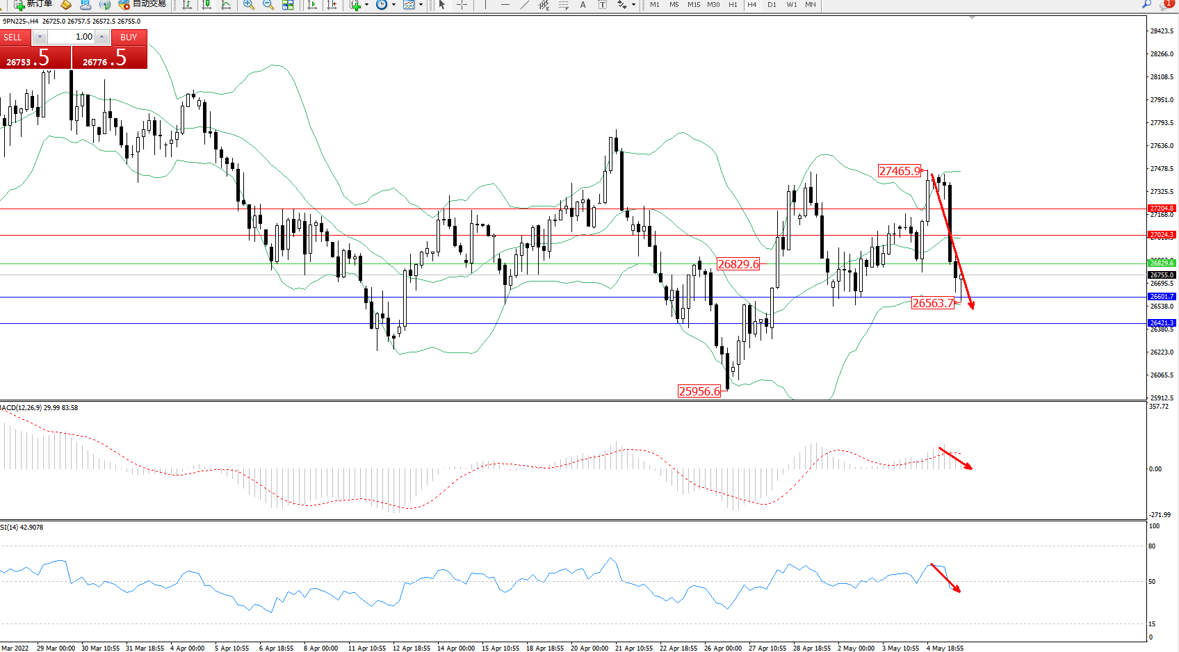 日经指数JPN225——4小时K线图显示: