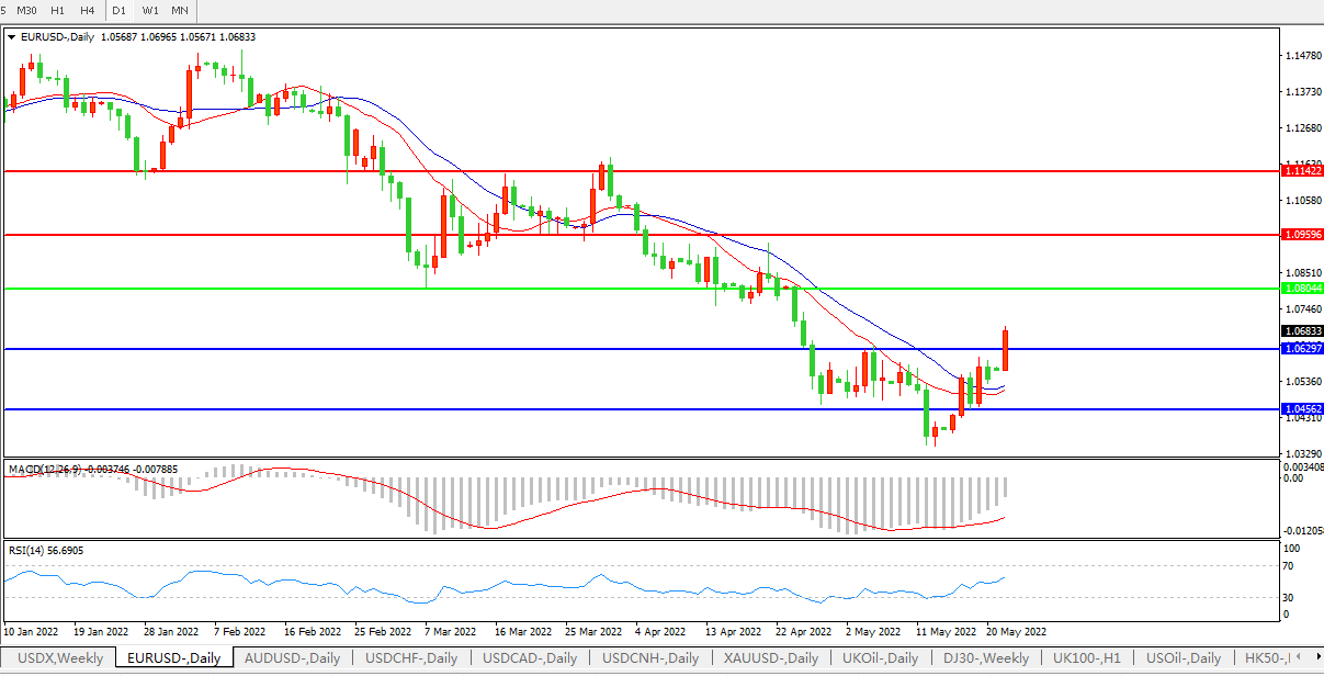 欧元/美元一度上涨1.2%,至盘中高点1.0697,为4月26日以来最高。欧洲央行行长拉加德的一篇博客文章强化了市场对该行将在7月开始加息的预期;与此同时,因全球股市上涨提振了风险情绪,令美元面临下行压力.