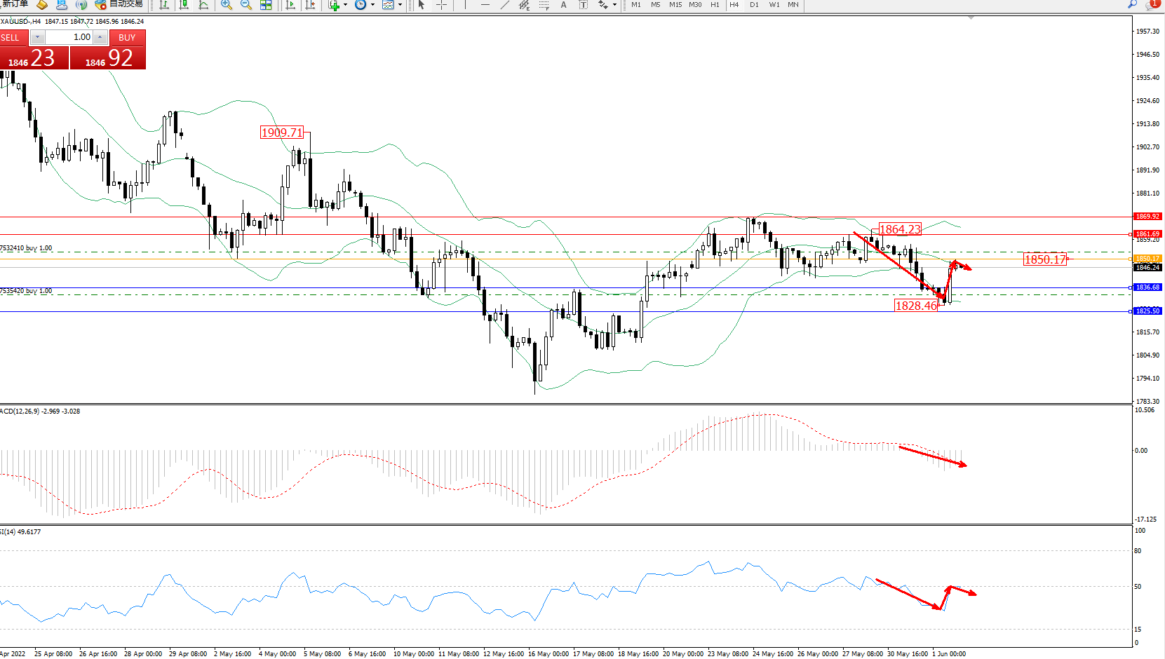 黄金XAUUSD——4小时K线图显示: