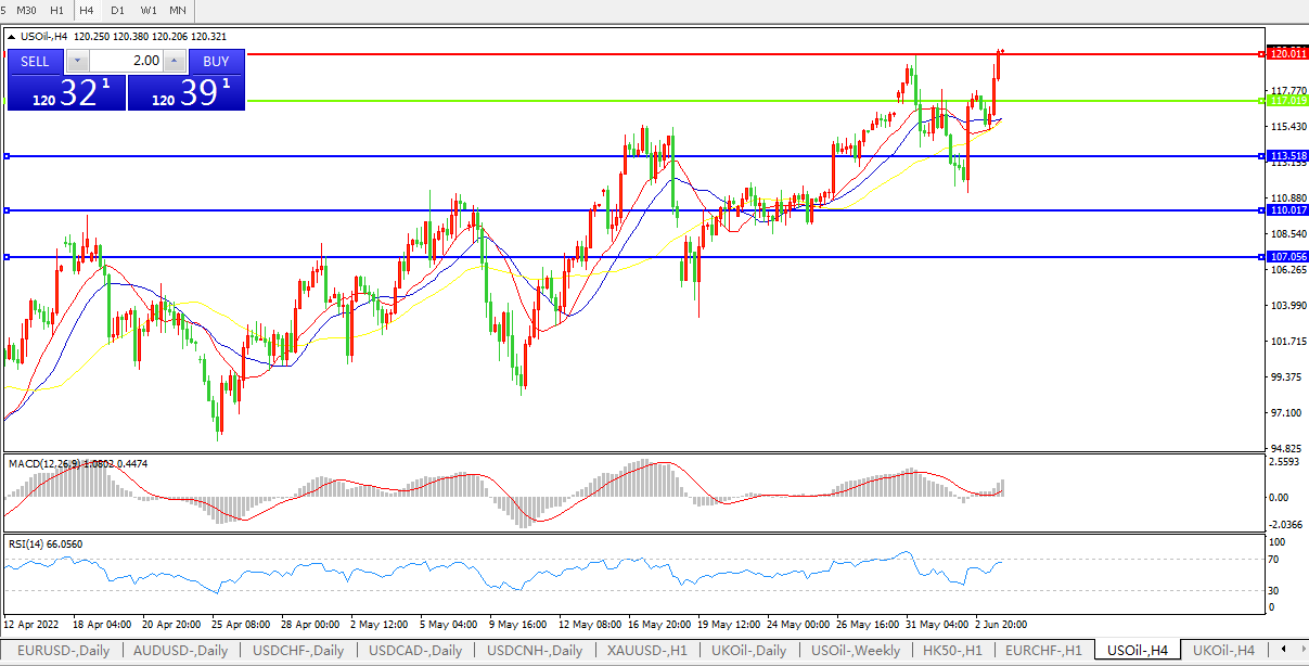 4小时图看,油价迅速拉升,短线极其强势 MACD量能柱伸长RSI指标再度回升,日内继续走高概率较大。