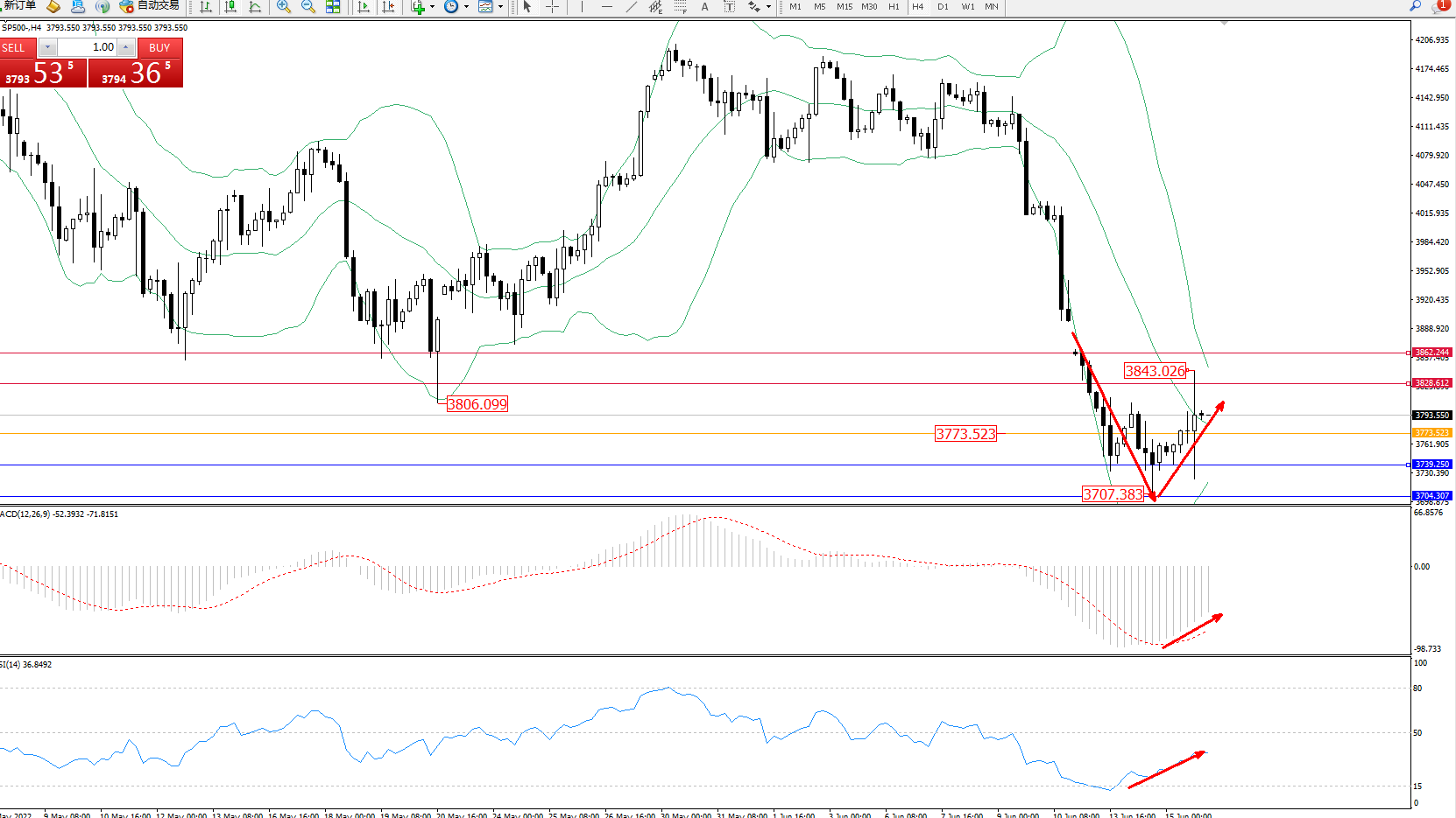 技术点评:空头动力延续布林带指标通道中下轨区间持续震荡下挫,低位抵达3707附近节点后震荡回升,多头动力有伺机入场迹象,布林带指标呈收口走势持续中,MACD指标处于空头区域低位维持震荡不断上移,RSI指标处于空头区域维持震荡缓慢向上移动;