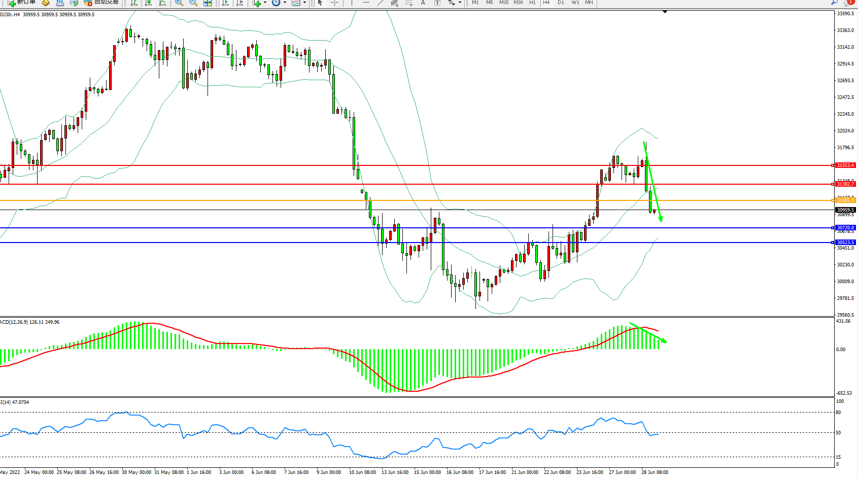 道琼斯指数6月28日(周二)收盘下跌490.48点,跌幅1.56%,报30947.78点;美国股市在广泛抛售中大幅收低,因为糟糕的消费者信心数据打压了投资者的乐观情绪,并加剧了对经济衰退和即将到来的财报季的担忧。