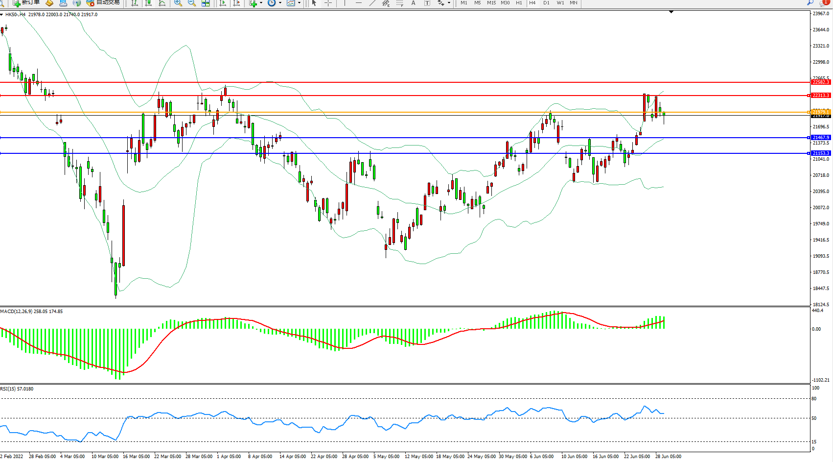 香港恒生指数6月29日(周三)收盘下跌422.08点,跌幅1.88%,报21996.89点;港股全天维持下跌行情,昨日热炒的餐饮、旅游等板块全线熄火,权重科技股亦集体走低。恒生科技指数跌3.27%,二者均再度失守22000点及5000点大关。盘面上,大型科技股网易跌超4%,小米、京东、网易、百度均跌3%,腾讯小幅收跌,录得3连跌。香港交易所香港特别行政区成立纪念日,北向交易关闭。
