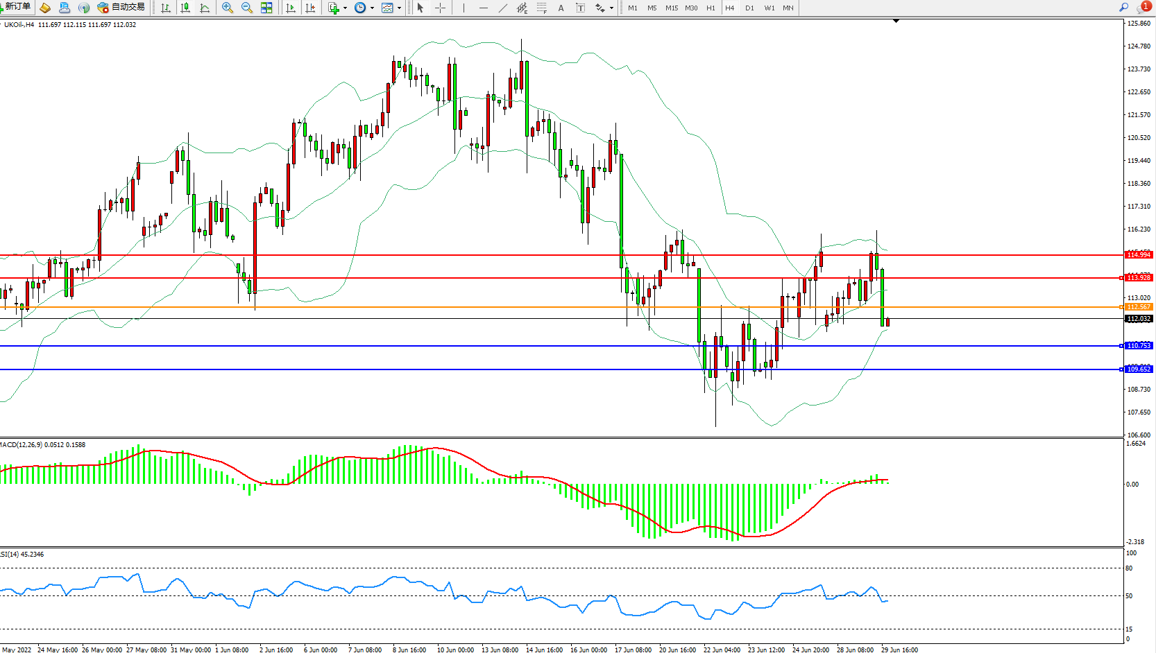 4小时图看:多头动力处于布林带指标通道中上轨区间持续宽幅震荡,空头动力伺机入场,急速下挫,触及布林带指标下轨附近节点后整理,布林带指标呈收口走势中,MAFCD指标处于0轴线上側徘徊,RSI指标处于50均衡线附近弱势震荡;
