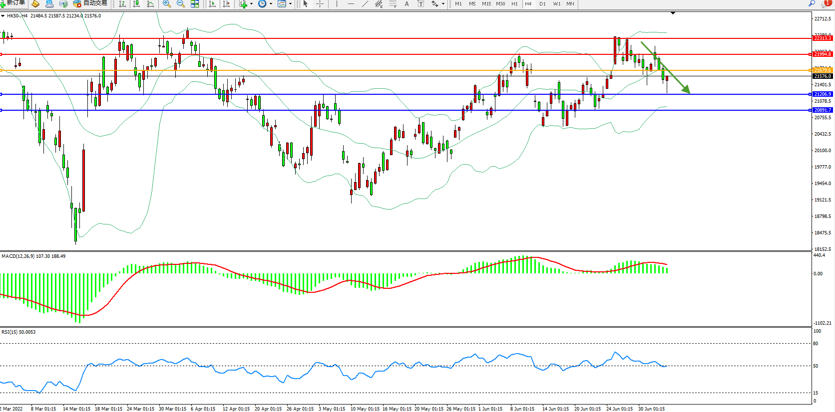 香港恒生指数7月6日(周三)收盘下跌266.41点,跌幅1.22%,报21586.66点;恒生科技指数跌1.23%。港股三大指数全线下跌,美指创20年新高,大型科技股多数走低,京东跌近4%,快手跌超2%,网易、百度、小米均走低,惟阿里巴巴逆势收涨1.56%;黑色系大宗商品重挫,市场担忧全球经济衰退加速。