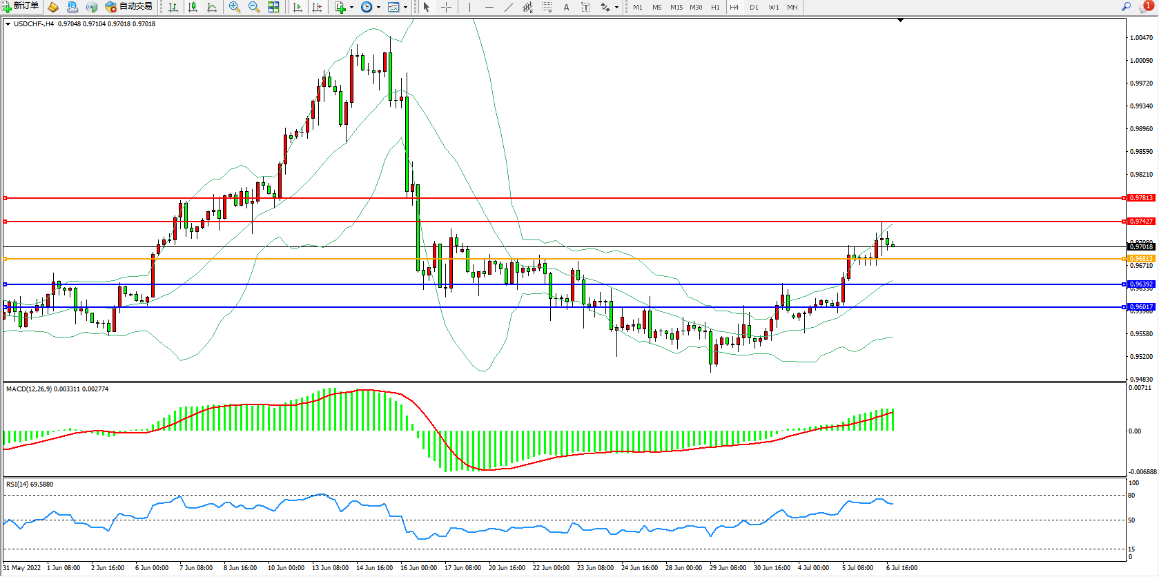 美元兑瑞郎维持0.97015附近震荡,欧元区6月商业活动增长急剧放缓,市场上普遍存在风险厌恶情绪。剧烈的波动也使瑞郎避险情绪升温。