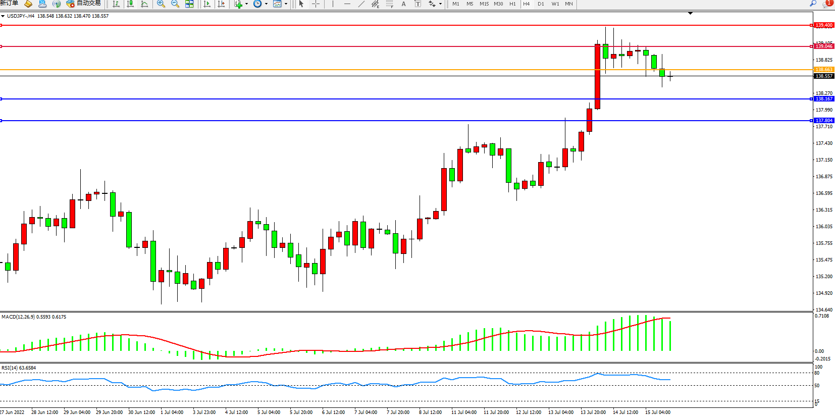 4小时图看:多头动力强势拉升上扬,高位遇阻整理后,空头动力伺机入场,开始缓慢下行,MACD指标处于多头区域高位维持整理平移,RSI指标处于多头区域维持弱势徘徊中;