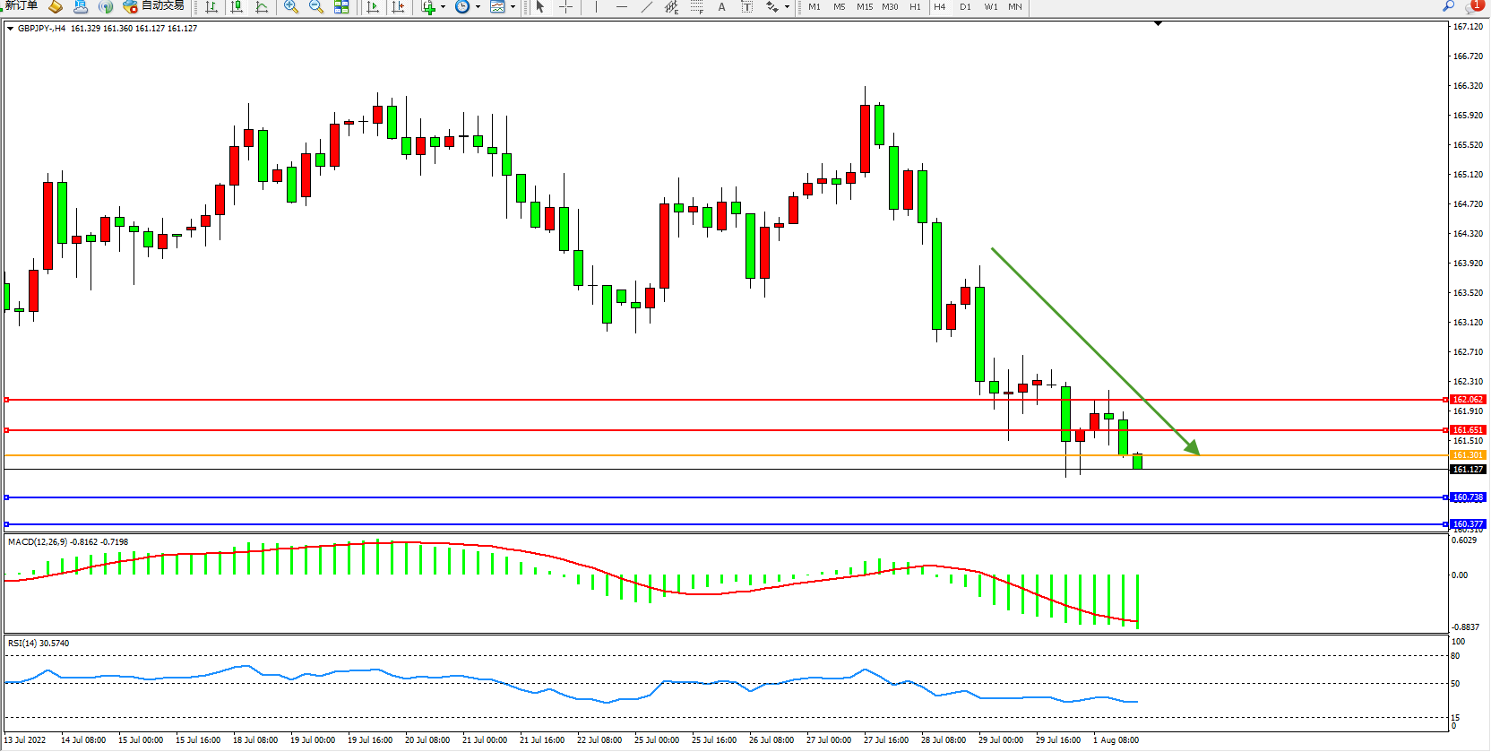 4小时图看:高位空头动力急速下行,低位短期窄幅整理,但市场整体偏弱势,短期跌势未见有止步迹象,MACD指标处于空头区域维持整理下行,RSI指标处于空头区域维持弱势徘徊;