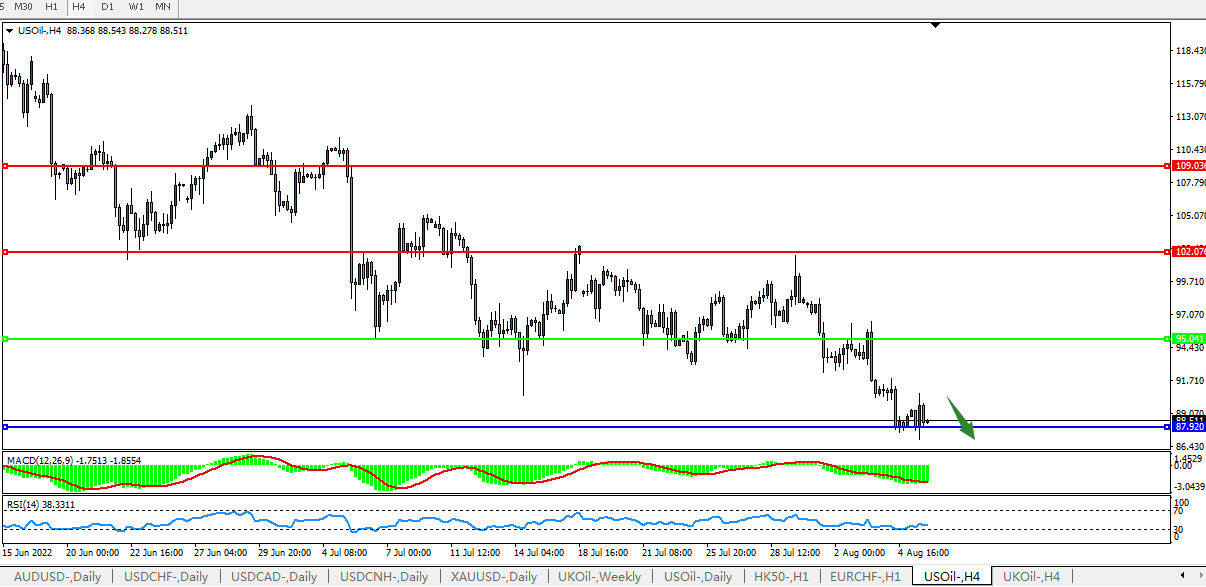4小时图看:油价击破整理区间下沿后开始快速下行, MACD量能柱0轴下方放量,RSI指标小幅反弹,短期价格在反弹修正后继续下行概率较大。