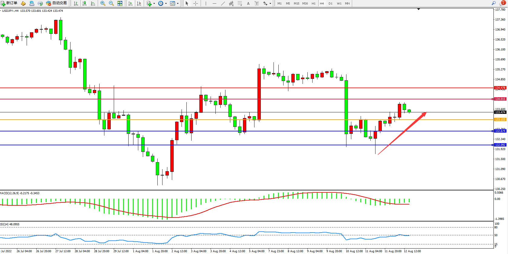 4小时图看:低位多头动力维持震荡上移,短期或处于向上移动,MACD指标处于0轴线下侧徘徊,RSI指标处于50均衡线附近弱势整理;