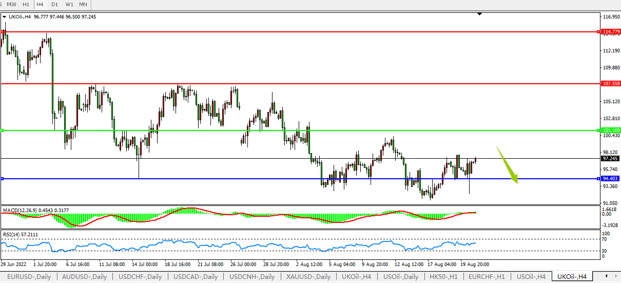 4小时图看:短线价格持续反弹,中期图形结构空头,适合逢高滚动沽空, MACD量能柱0轴附近量能不足,RSI整理无方向,短期油价反弹概率较大。