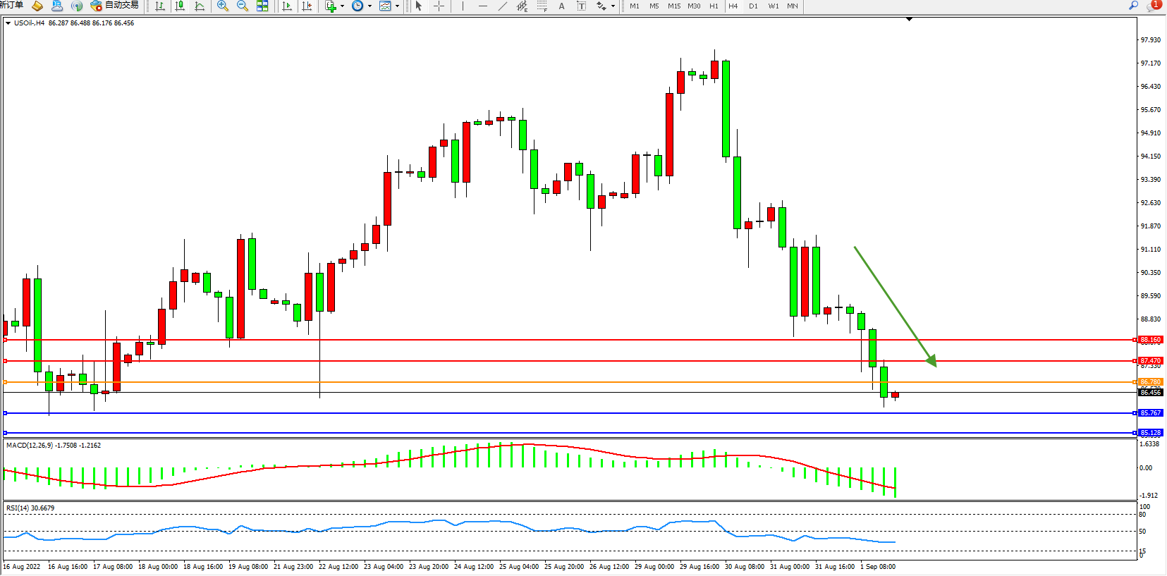 4小时图看:空头动力急速震荡下挫,抵达前期低位后有继续向下移动态势,短期跌势未见有止步迹象,MACD指标处于空头区域维持整理下行,RSI指标处于空头区域维持窄幅整理;