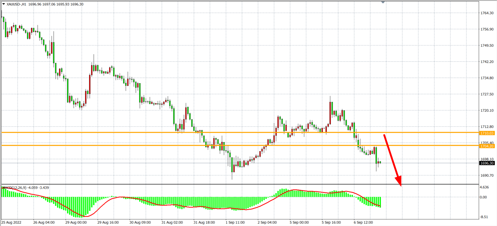 1小时图看,金价拐头向下连破关键支撑,MACD于零轴之下持续放量,显示趋势有进一步下跌动能,阻力目前主要集中于1705-1710美元区域,日内在1710之下继续看跌下方1680-1660。