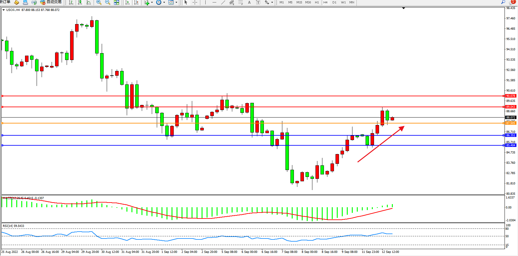 交易策略:87.505上方看涨,目标89.043、90.078