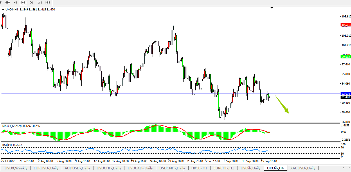 4小时图看:短线价格宽幅整理反复无常,中期图形结构中性, MACD量能柱0轴上小幅缩量,RSI整理偏弱,短期油价继续反弹后再度下行概率较大。