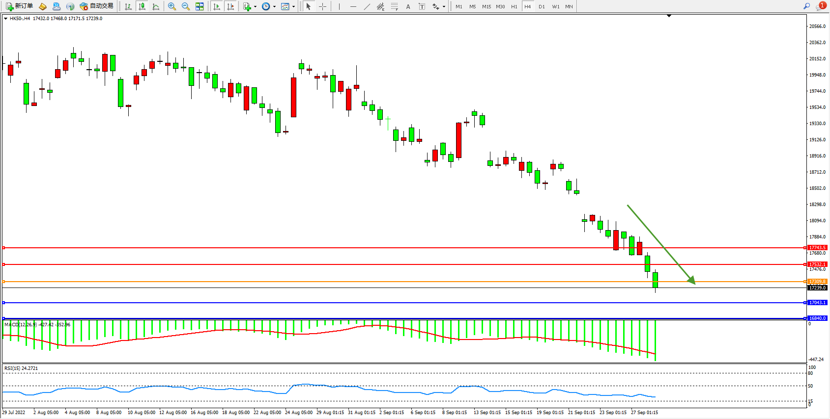 香港恒生指数9月28日(周三)收盘下跌609.43点,跌幅3.41%,报17250.88点;港股三大指数低开低走,尾盘跌幅进一步加大,行业板块近乎全部下挫,市场情绪表现十分低落。恒指跌3.41%下挫超600点,国指跌3.12%,恒生科技指数跌3.85%亦跌破3600点,且三者再度刷新调整低价。权重科技股全线下跌拖累大市下挫。