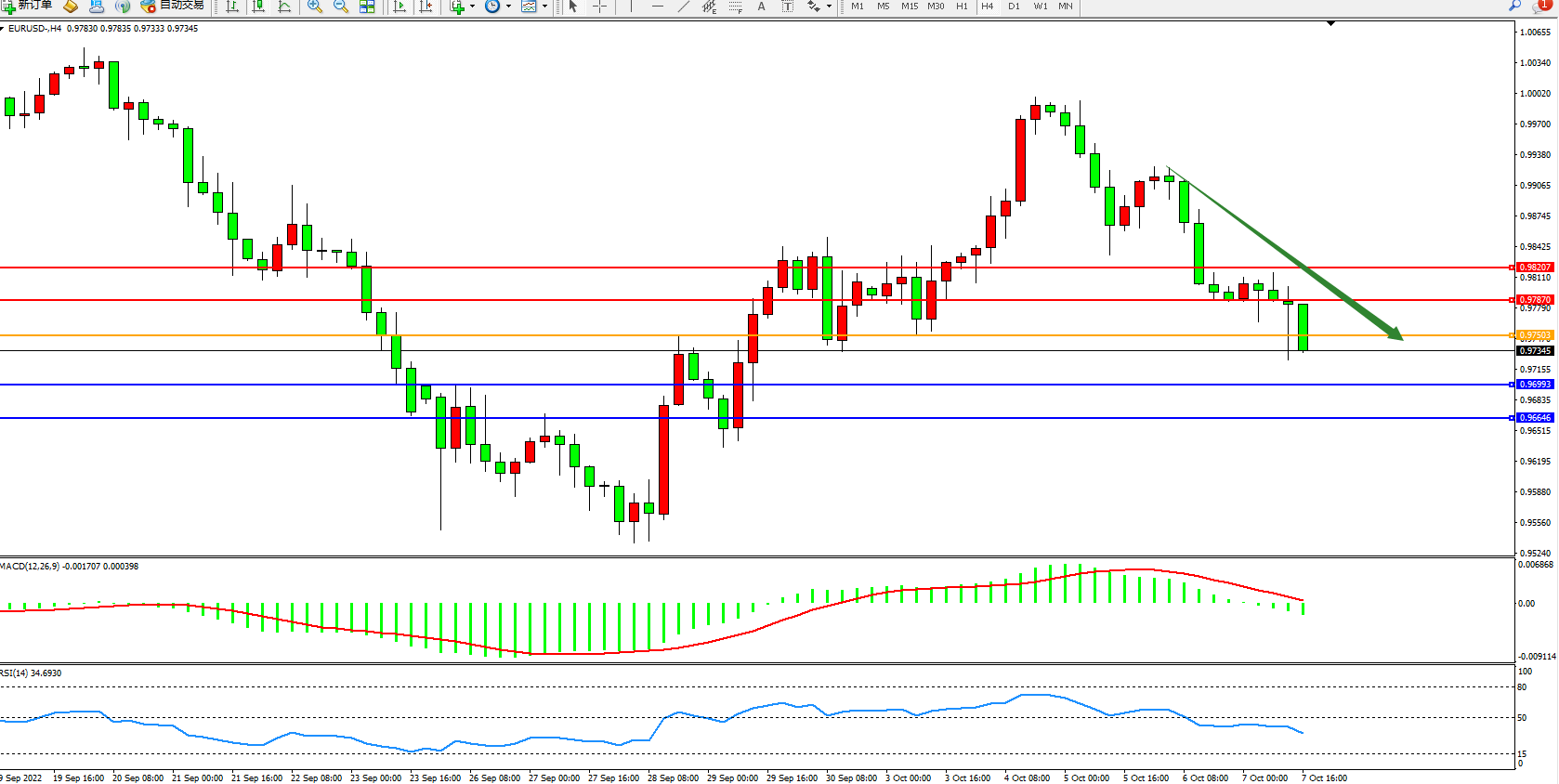 交易策略:0.97503下方看跌,目标0.96993、0.96646